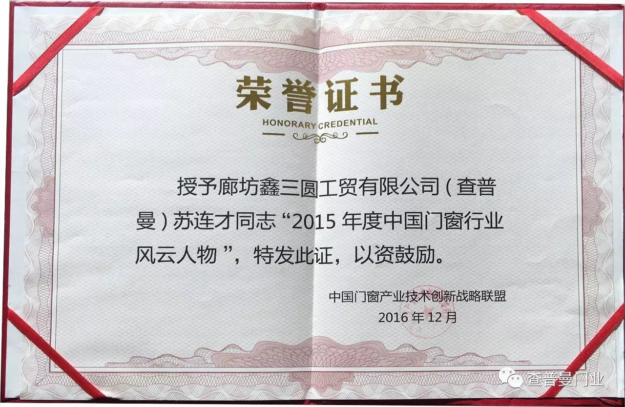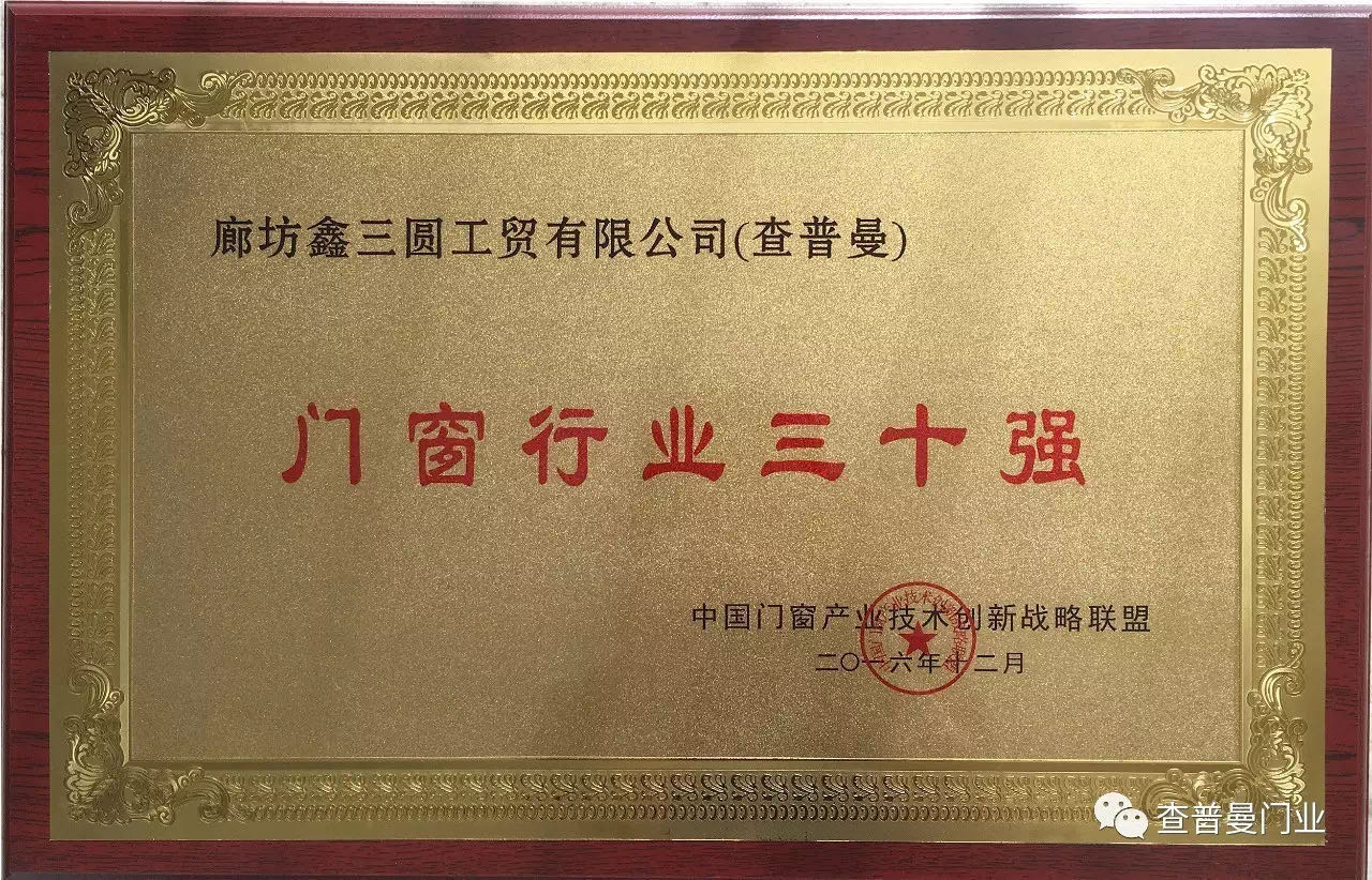 2016年12月11日查普曼应邀参加2016五金·门窗年度产业峰会,峰会对门窗、五金行业突出的企业及个人进行表彰。查普曼共获3项殊荣,查普曼被授予“中国门业30强”称号,董事长苏连才先生被授予“中国门业风云人物”以及授予品牌经理苏连禹的创新进步奖。